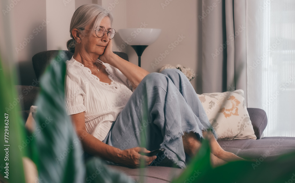 Beautiful relaxed smiling white haired senior woman sitting on sofa at home lost in her thoughts