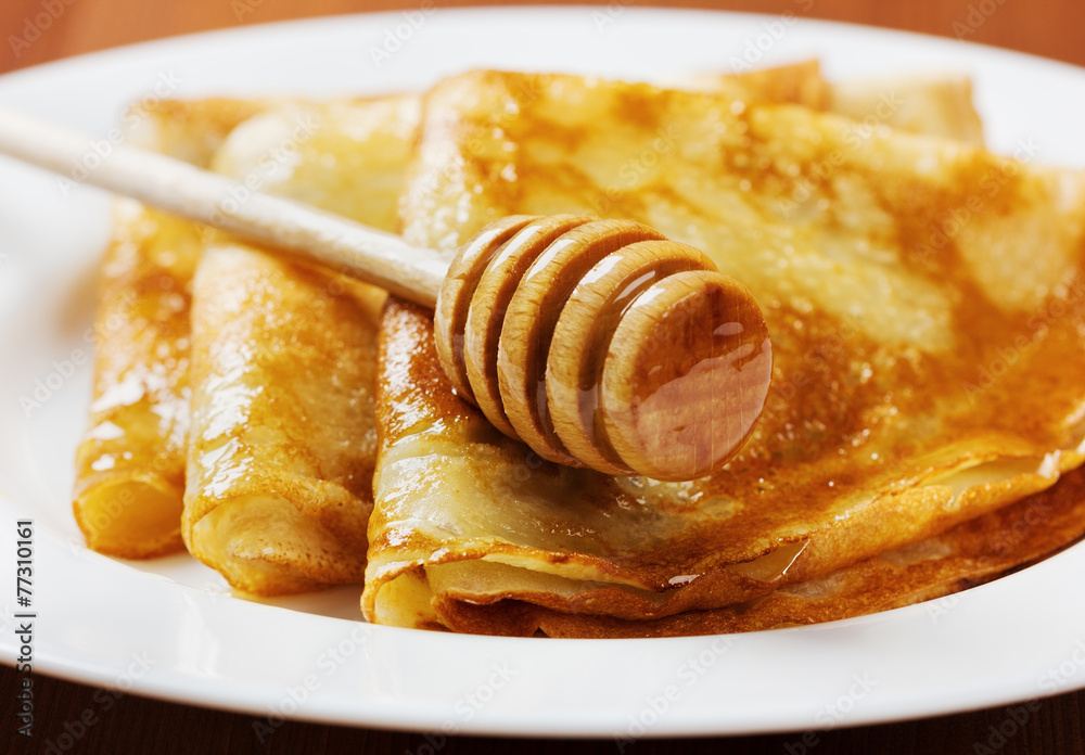 pancakes with honey syrup. crepe for pancake week or Shrovetide