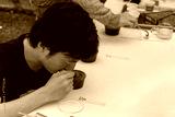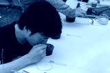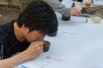 Coffee hunter inspecting cupping coffee sample