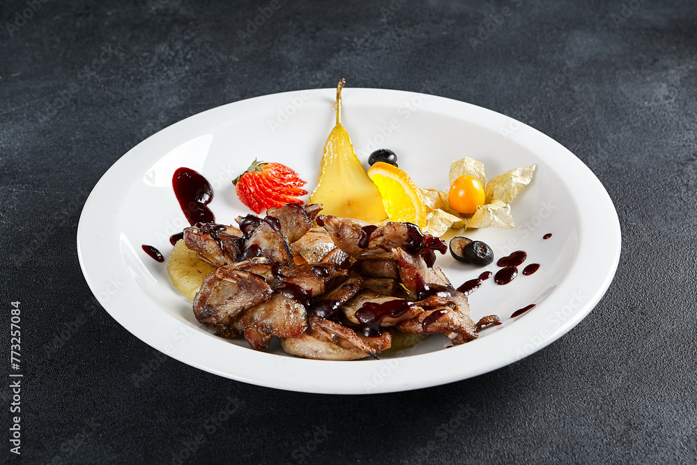 Gourmet teriyaki chicken wings paired with vibrant fruits on a textured black table. A symphony of taste and elegance in culinary presentation