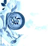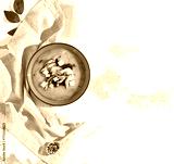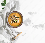 Aromatic miso soup with shrimp, tofu, and mushrooms, elegantly presented in a ceramic bowl, top view with rustic linen