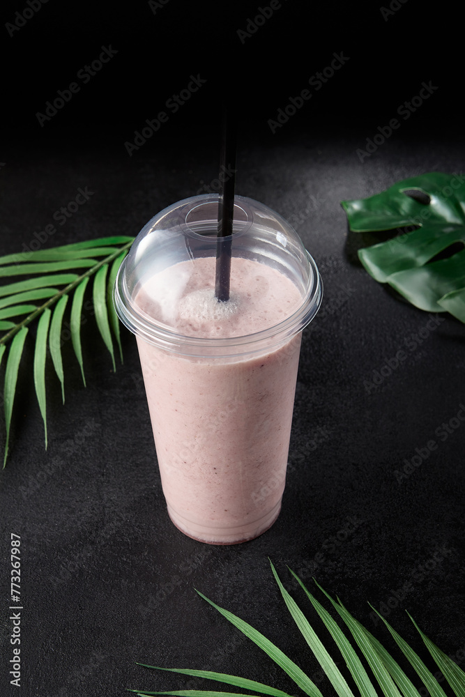 Strawberry shake in take out glass on dark background with leaves. Mock up drink in minimal concept with black background and palm. Berry milkshake for presentation packaging. Shake in plastic glass.