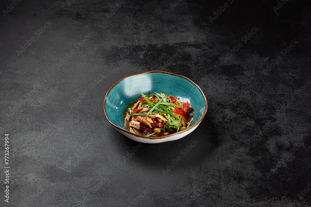 Asian salad with chicken and vegetables in ceramic bowl on dark concrete background. Salad with chicken, muer mushrooms and green onion in chinese cuisine style. Asian menu in minimal style on black.