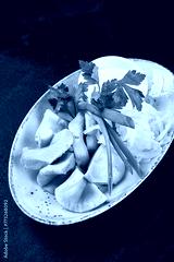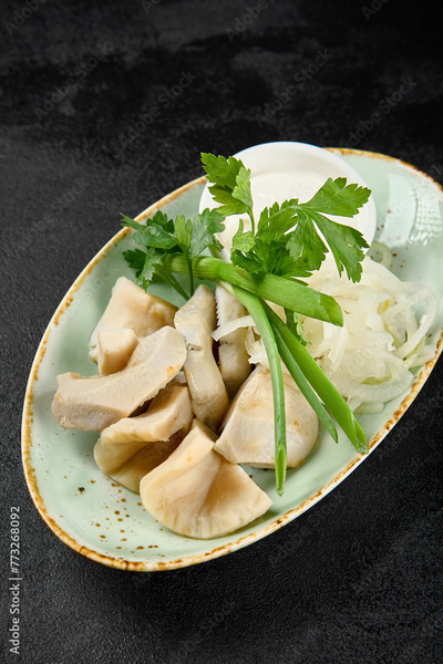 Russian appetizer from salted milk mushrooms with sour cream and onion on dark concrete background. Salted gruzdi in minimal style on black table. Mushroom appetizer on plate. Milk mushrooms.