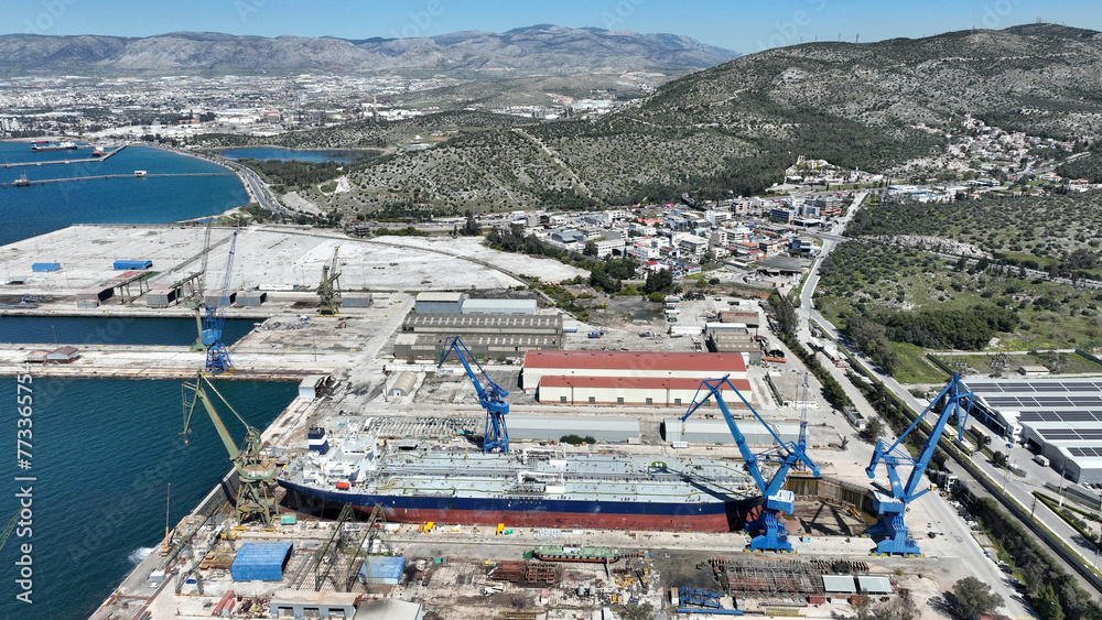 Aerial drone photo of port town and recently renovated ship yard of Skaramagas in Western area of Attica, Elefsina bay, Attica, Greece