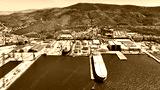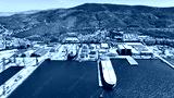 Aerial drone photo of port town and recently renovated ship yard of Skaramagas in Western area of Attica, Elefsina bay, Attica, Greece