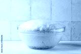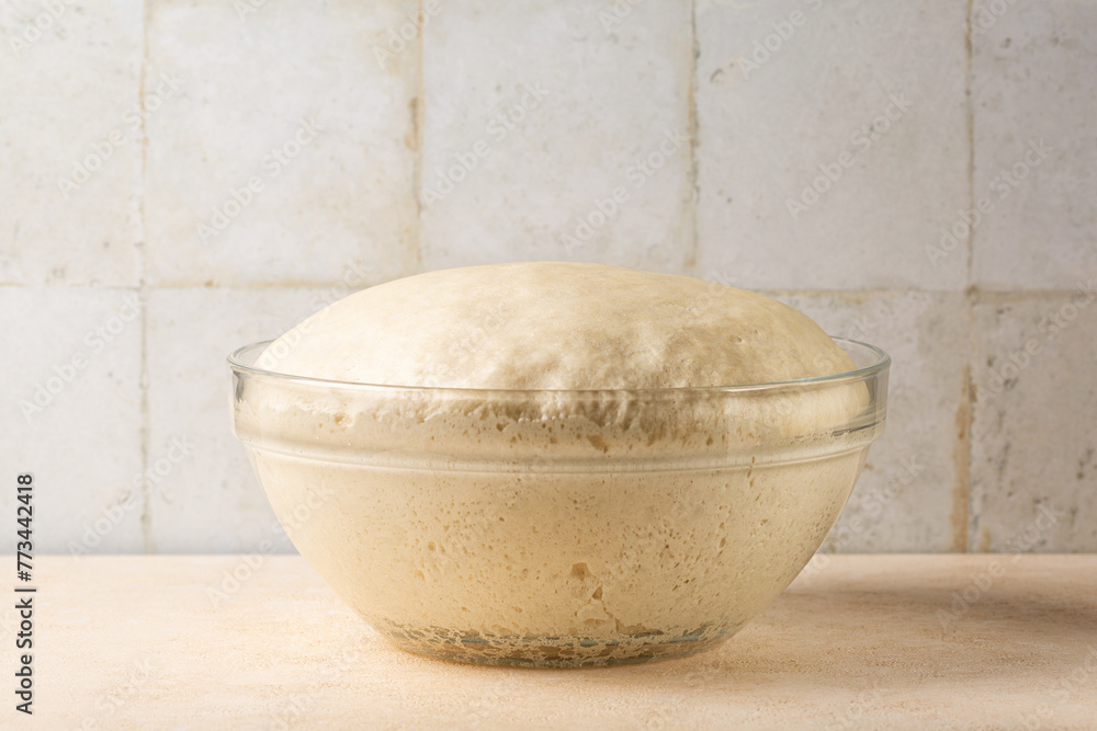 Glass bowl with fresh homemade yeast dough on a kitchen table.
