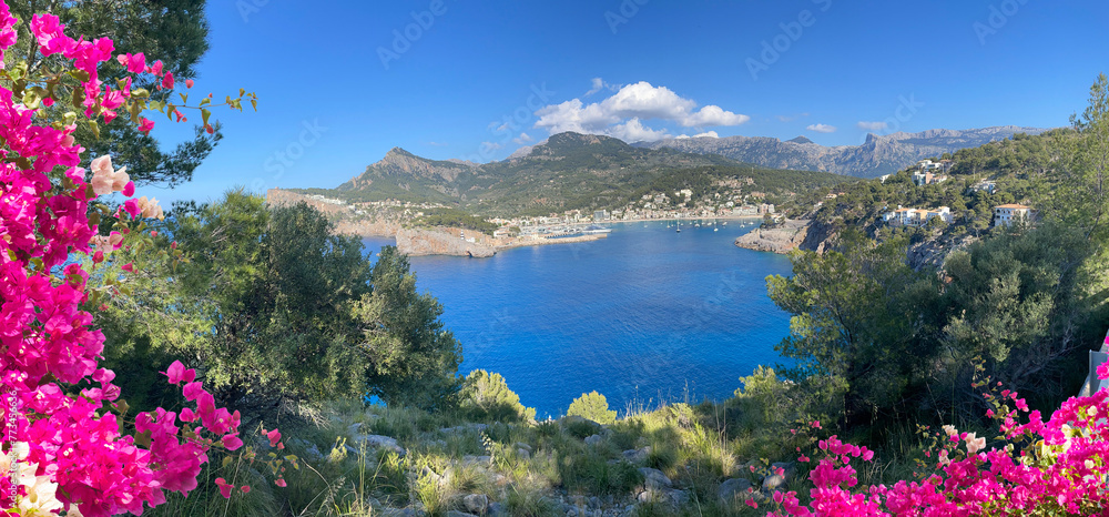 view of Port Soller harbour from above, Mallorca at summer, Spain