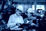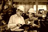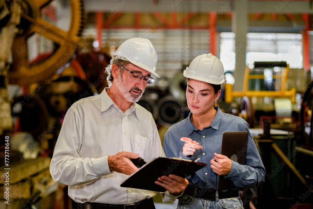 Two professional technician engineer worker use clipboard checking operating equipment machine monitors and check Production process machinery. Two engineer confederate control factory machine