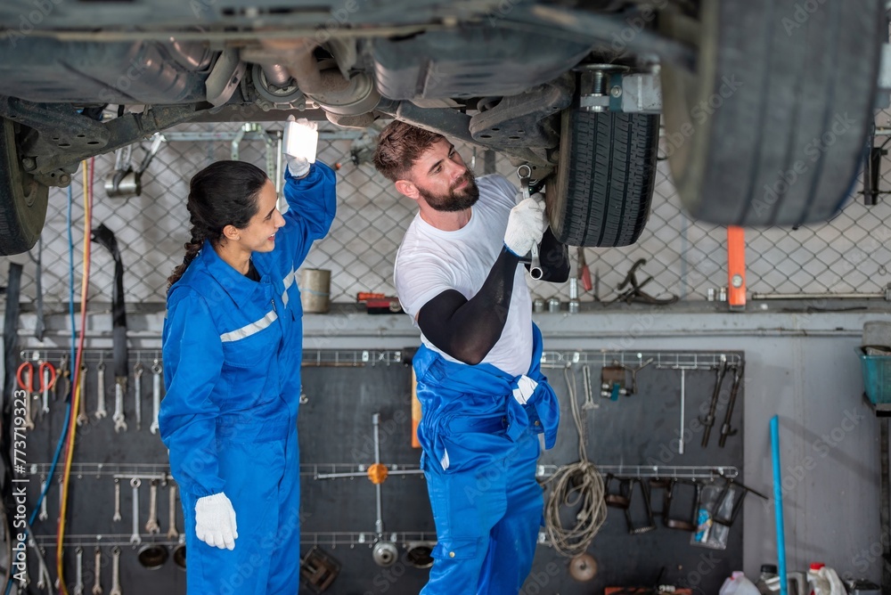 auto two professional mechanical technician garage motor car engine team check automobile engine for diagnostic maintain transmission machine. technician worker auto in garage check engine car motor