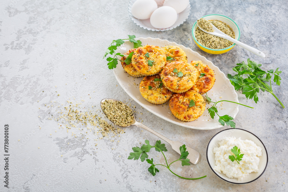 Homemade egg and zucchini muffins with feta cheese, savory courgette with ingredients