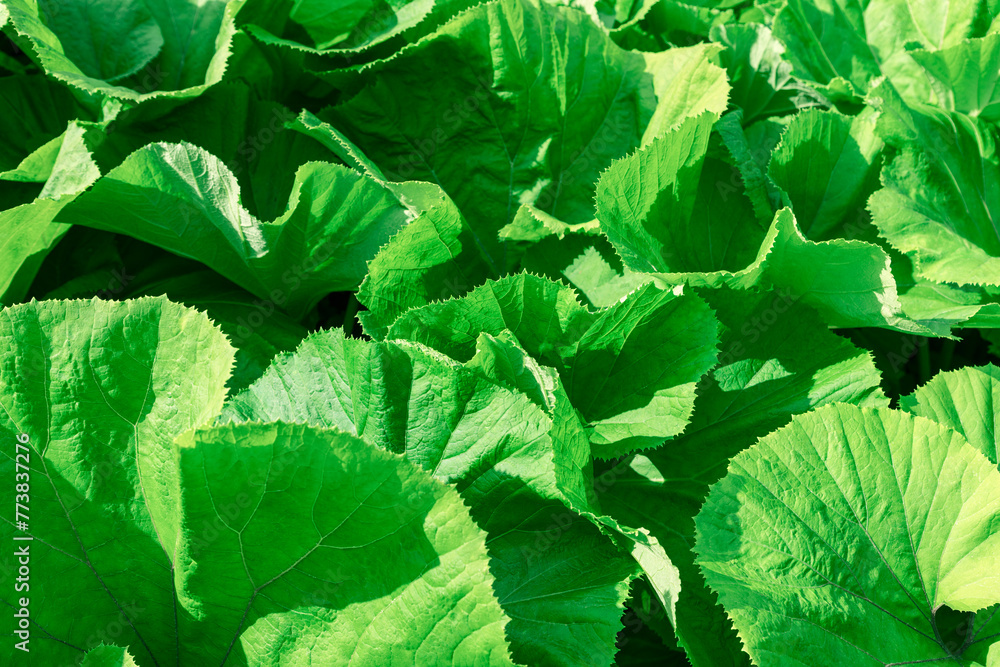 Lush green leaves fill the frame with their vibrant texture, creating a fresh and natural backdrop