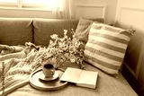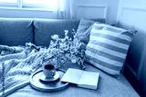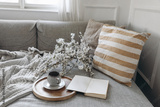 Modern spring scandinavian living room interior. Sofa with linen yellow striped cushions and cup of coffee. Cherry plum blossoms in vase. Open blank book, diary or notepad. Elegant home office decor.