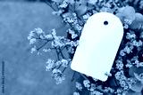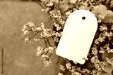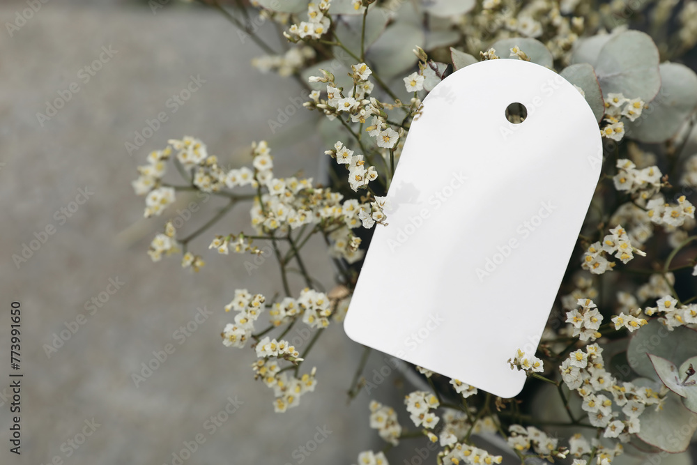 Floral wedding, birthday mockup. Empty paper gift tag, label. Limonium flowers and eucalyptus tree branches bouquet in metal bucket. Blurred background. Sale, floristry branding concept