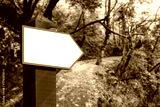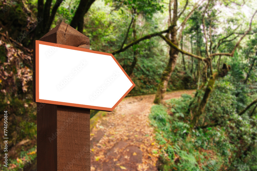 Dirrection arrow. Signpost outdoor. Empty copy space sign. Tourist destination. Blank guide post. Forest road hiking trail. Mountain jungle landscape. Sightseeing route.