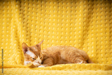 Red Ginger Devon Rex Cat. Short-haired Cat Of English Breed On Yellow Plaid Background. Shorthair Pet Washing Paws.