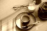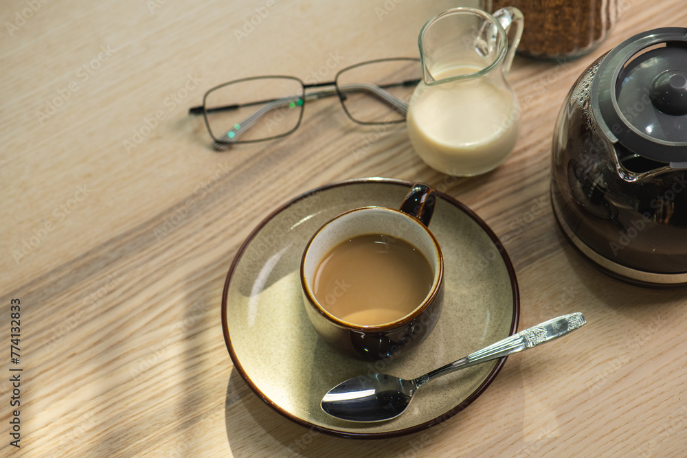 cup of hot Instant coffee dark shot in cup with crema on wooden table and beans . coffee beans and cup full of Intense dark shot coffee in glass cup