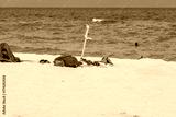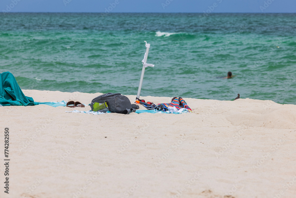 Personal belongings scattered carelessly on a sandy beach. Miami Beach. USA.