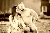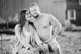 Young woman sits on chair in garden and looks at shirtless white man who puts his arm around her waist, summer family portrait of married couple in their 20s.