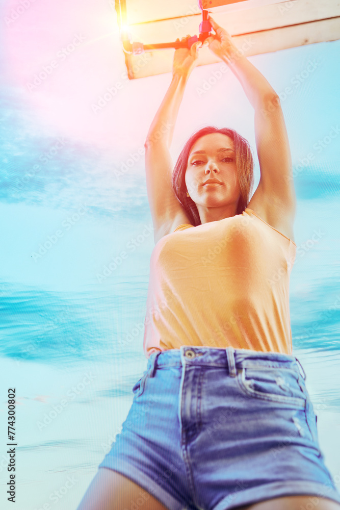 Do it yourself repair of leaking outdoor water pipe, white woman in her 20s tightens compression fitting nut at leak site.