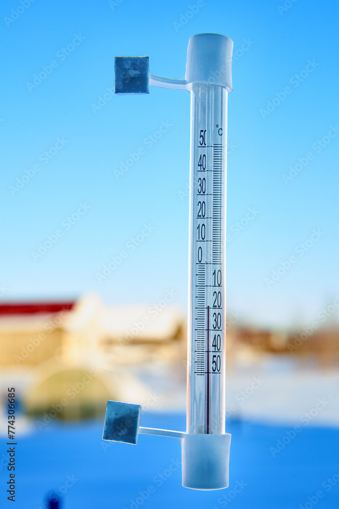 Low air temperature is indicated by an outdoor thermometer with scale in degrees Celsius, fixed to outside of window glass with adhesive tape.