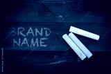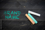 Brand Name. Text and pieces of chalk on a dark wood texture background
