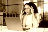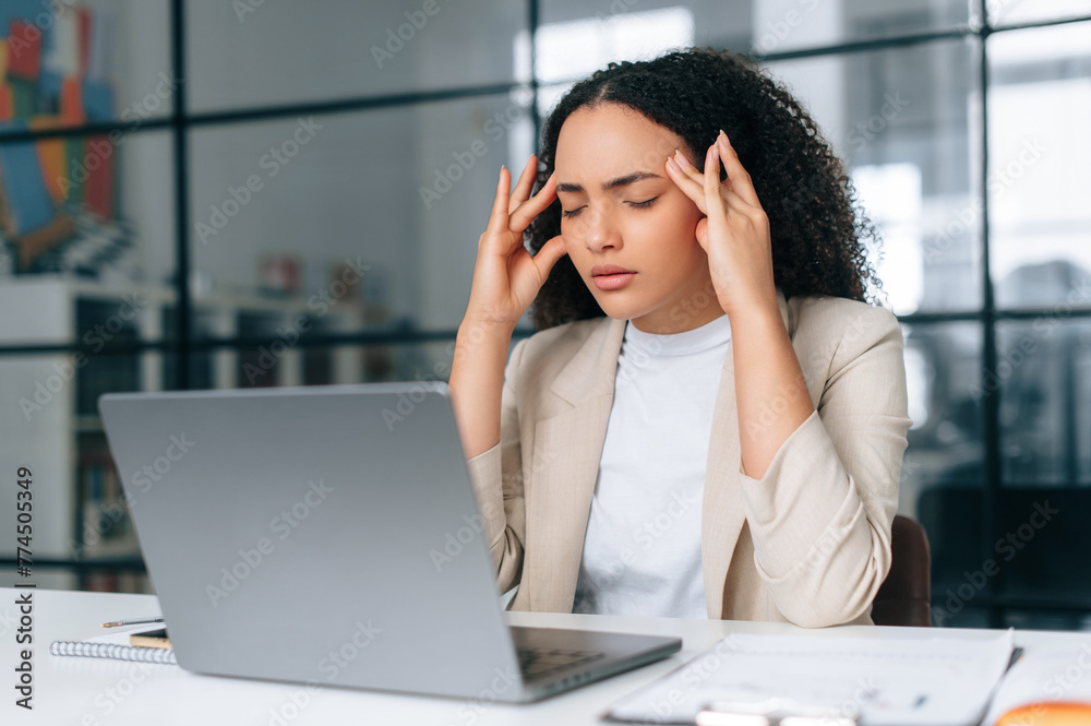 Tired overworked brazilian or hispanic curly haired woman, company employee, working on a laptop in modern office, has a headache, migraine, massages temples with eyes closed, needs rest