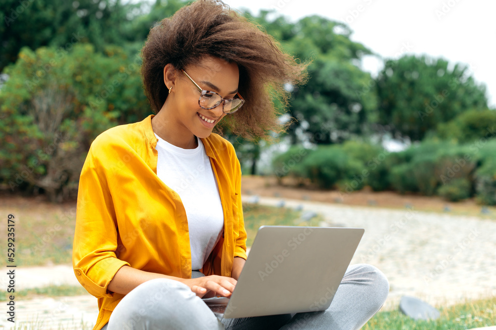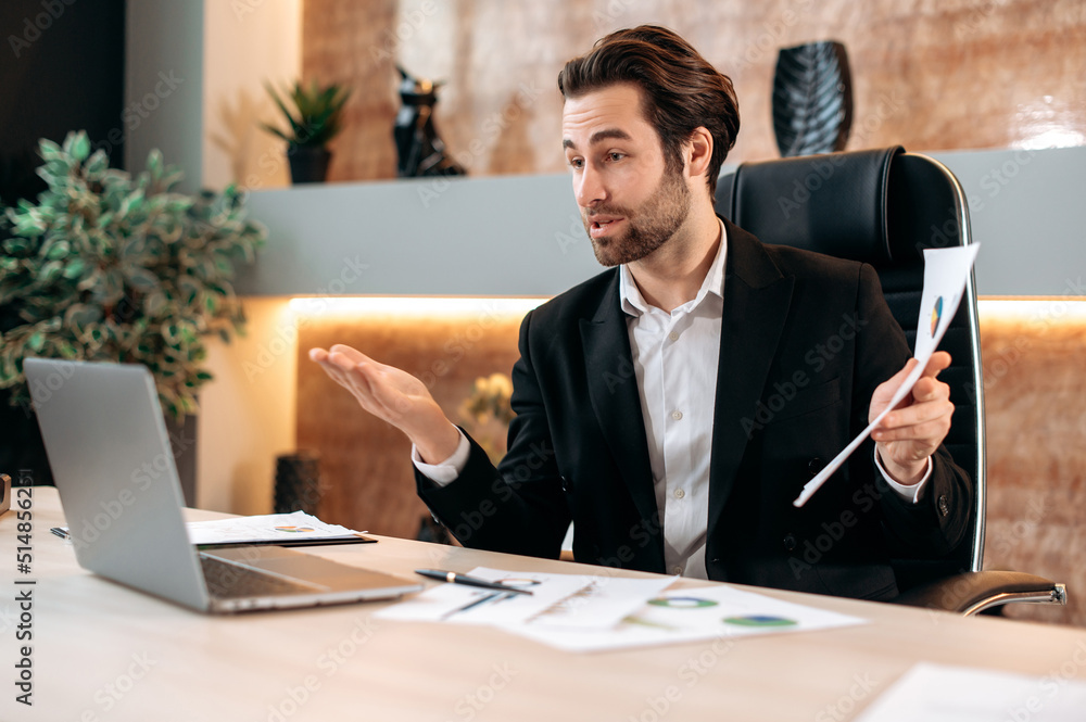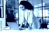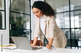 Successful serious confident curly haired business woman, corporate manager, standing near work desk in a modern creative office, focused working in a laptop, browsing information, analyzing