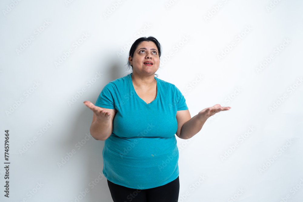 Overweight indian woman looking up with open arms. isolated over white background. Plus size female. upset with weight, Hope, Healthcare