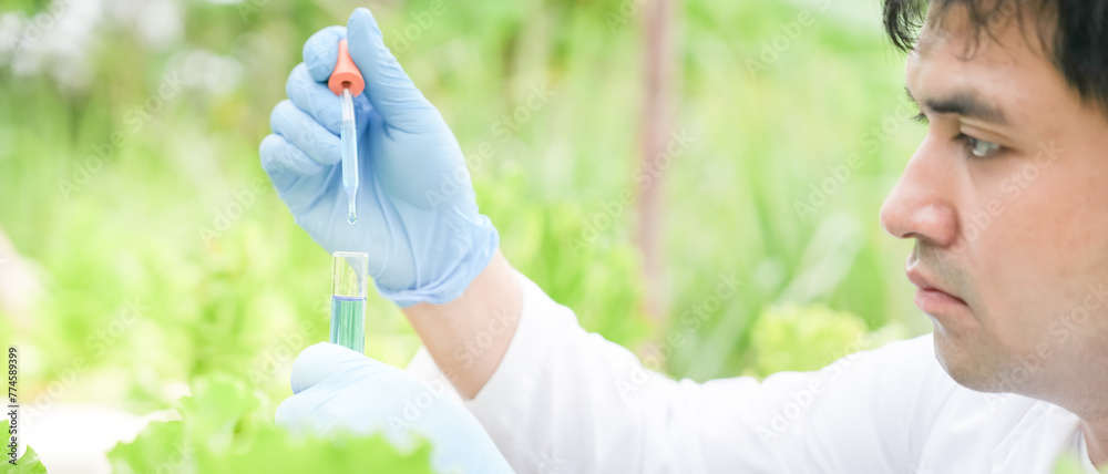 Organic farming, salad farm. Science farmers are checking water conditions during planting, checking for pesticide residues. Hydroponics vegetable, Ecological Biological, Healthy, Vegetarian, ecology