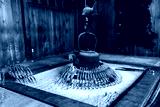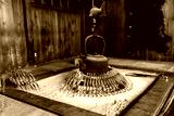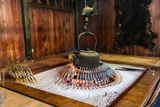 Traditional Japanese fireplace in a mountain hut cooking freshly caught Iwana (Grilled Char)