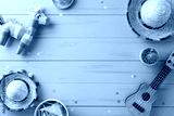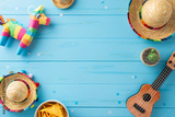 Cinco de Mayo-themed display: top view of sombreros, vihuela, cactus, lama pinata, nachos and confetti on bright wooden blue background. Perfect for promotional materials