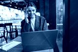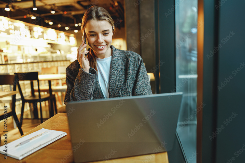 Young female freelancer talking with client and work on laptop in cafe. Distance work concept
