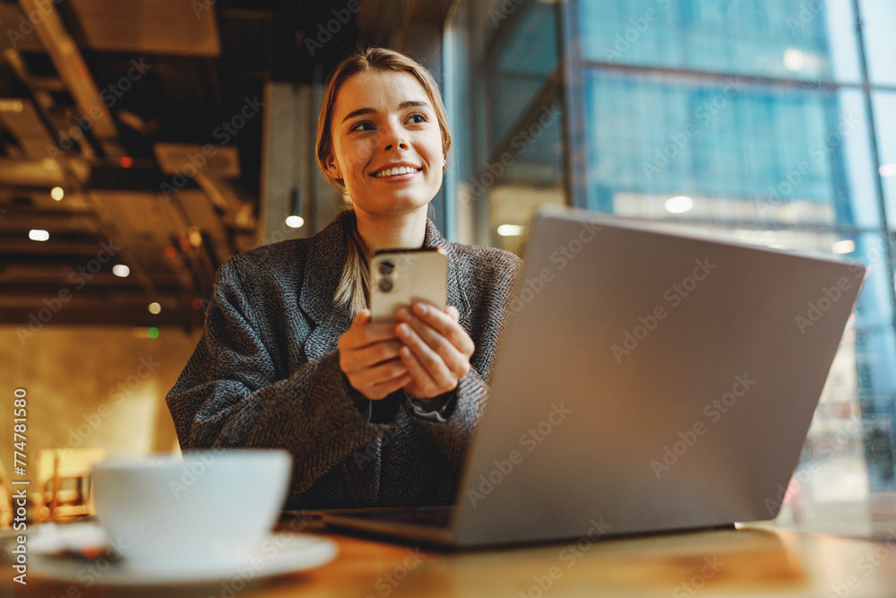 Woman manager reading message on phone and work on laptop in cafe. Distance work concept