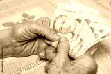 Hands of an elderly woman hold several Singapore dollars in their hands, Economic concept, Home budgets of pensioners in Singapore, rising cost of living and expenses