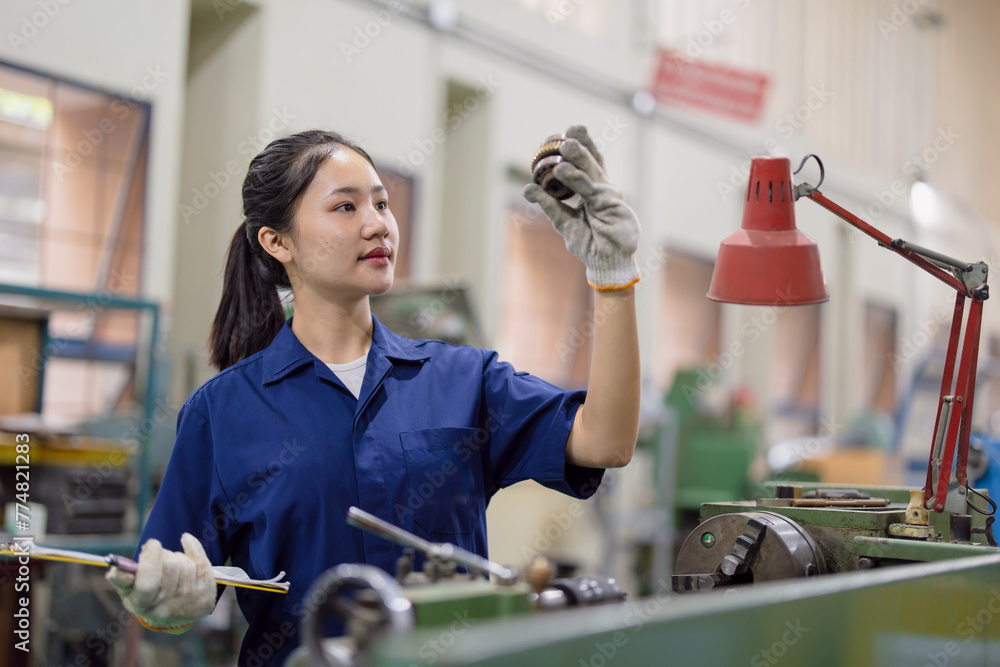 Asian women worker work in heavy industry with CNC lathe milling metal machine in steel product factory