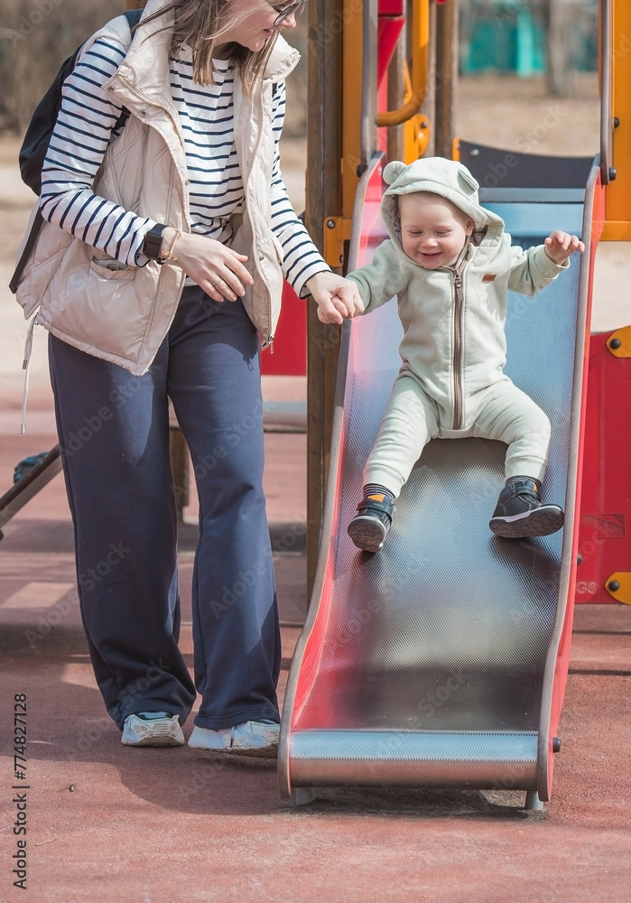 A beautiful, cheerful little boy of two years old walks with his mother on the playground in the spring. Mom rolls the baby down a slide in the park. The concept of parenthood, childhood and family.