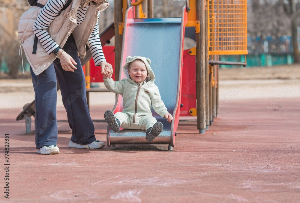 A beautiful, cheerful little boy of two years old walks with his mother on the playground in the spring. Mom rolls the baby down a slide in the park. The concept of parenthood, childhood and family.