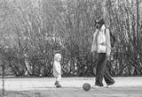 A handsome, cheerful little boy of two years old walks on the street in the spring. A kid in a jumpsuit plays ball with his mother. The concept of parenthood, childhood and family.