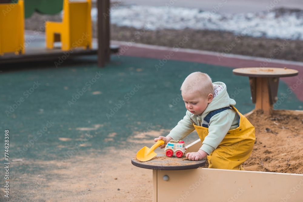 A beautiful, cheerful little boy of two years old walks on the playground in the spring. A child is playing with a shovel in the sandbox. The concept of parenthood, happy childhood and family.