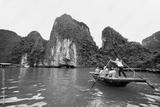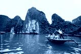 Group of tourist and unindentified woman paddling in the Ha long bay, very famous tourist attraction in Vietnam.