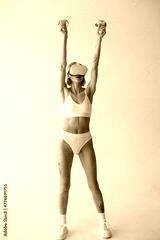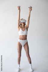 Beautiful thin girl in white shorts and a top in a virtual reality helmet posing on a white background