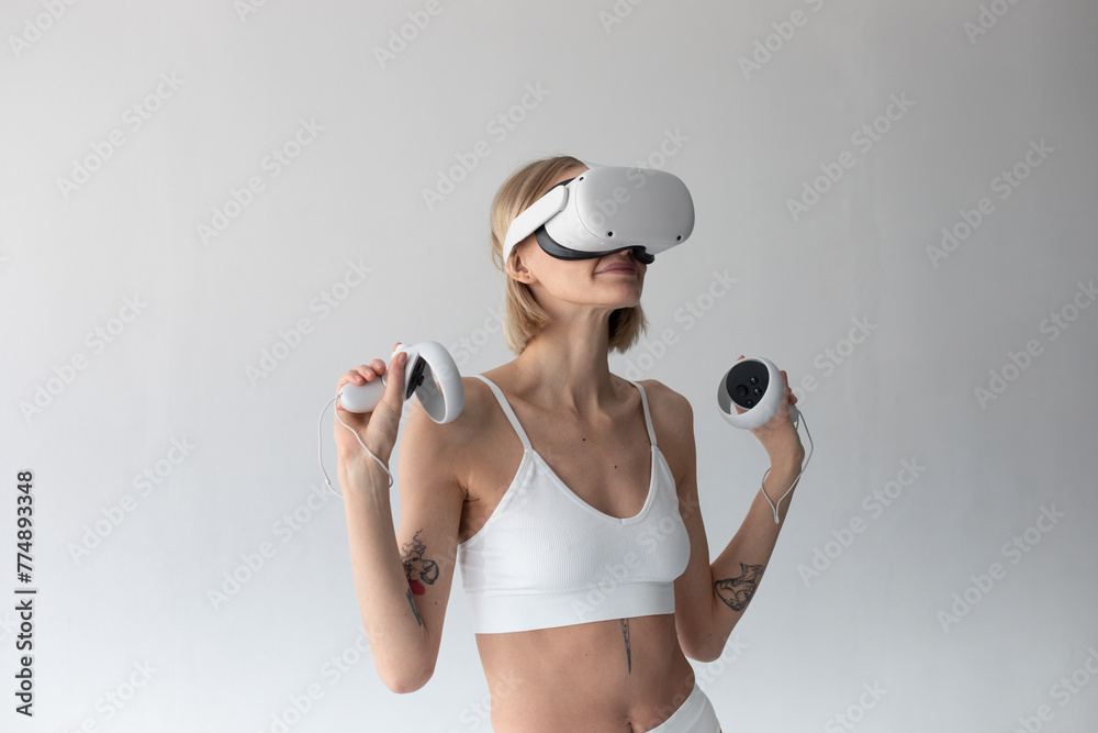 Beautiful thin girl in white shorts and a top in a virtual reality helmet posing on a white background