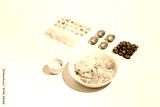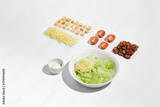 Deconstructed Caesar salad ingredients with neat geometry isolated on white background