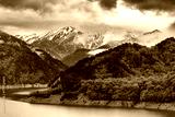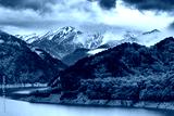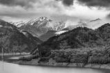 Snow covered mountain peaks and stormy skies over a large lake (Kurobe Dam, Toyama, Japan)