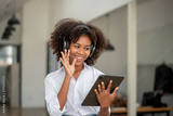 African American woman with headphones and tablat enjoy with social chat with firends or family video call with team