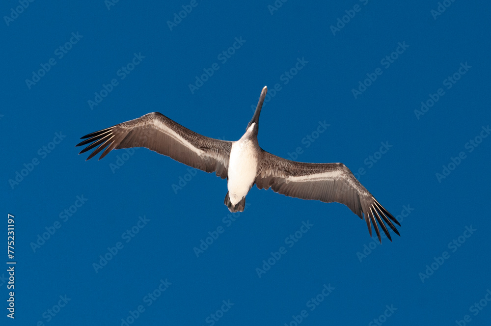 Pelicans are flying over the sea
