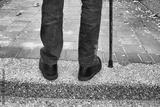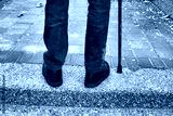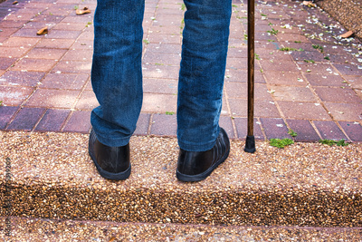 Senior man on a rehabilitation after surgery with walking cane outdoors.