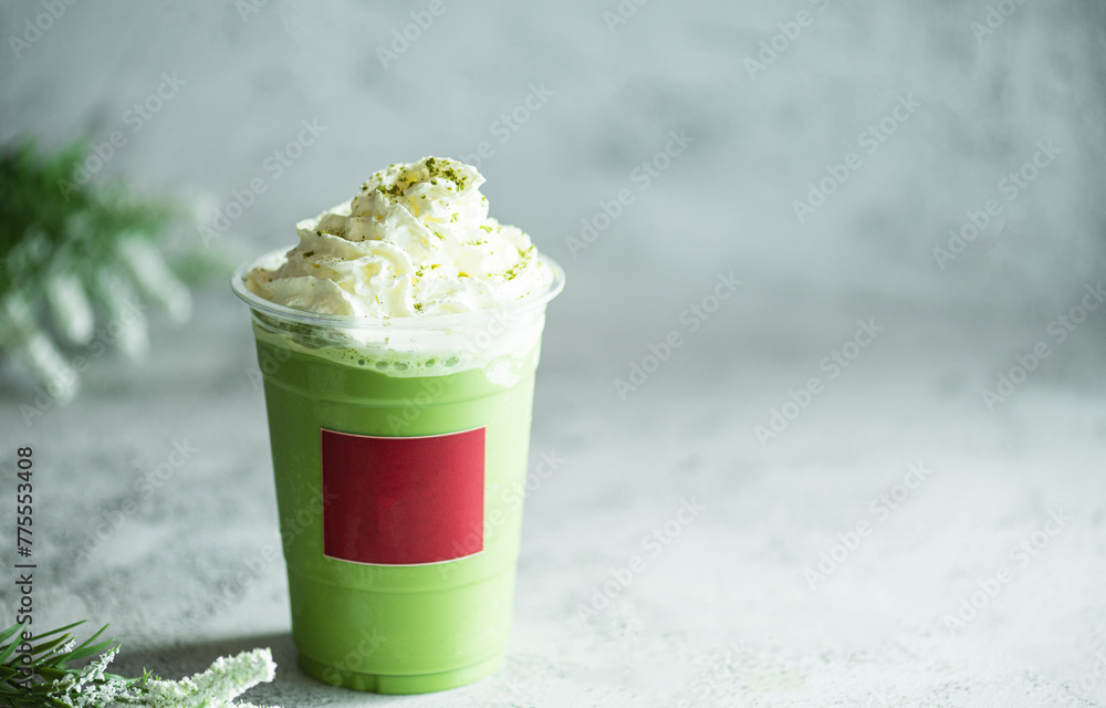 Iced green matcha latte tea and milk in glass on stone table background. Traditional japanese drink and beverage concept.