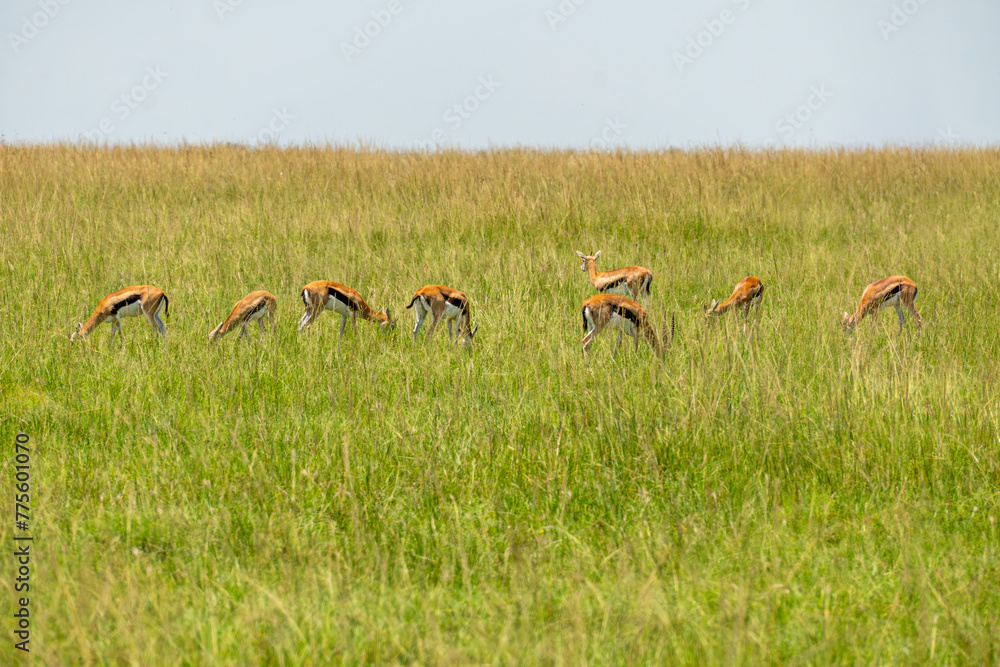 antelopes grace in the tall green grass. Group female Impala in Massai Mara